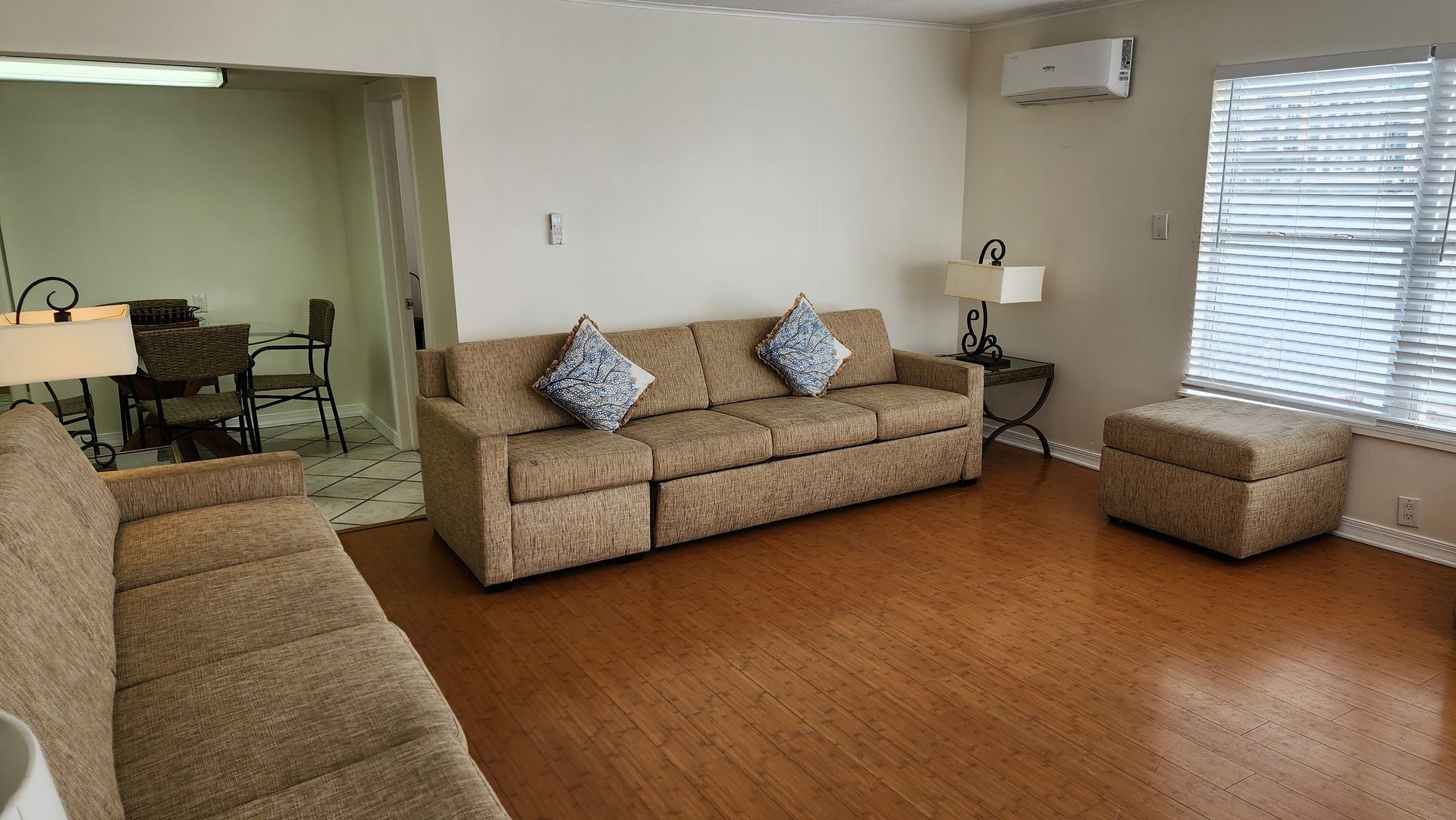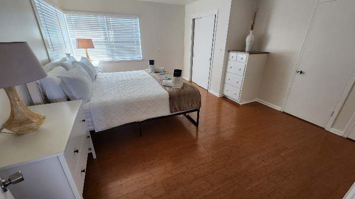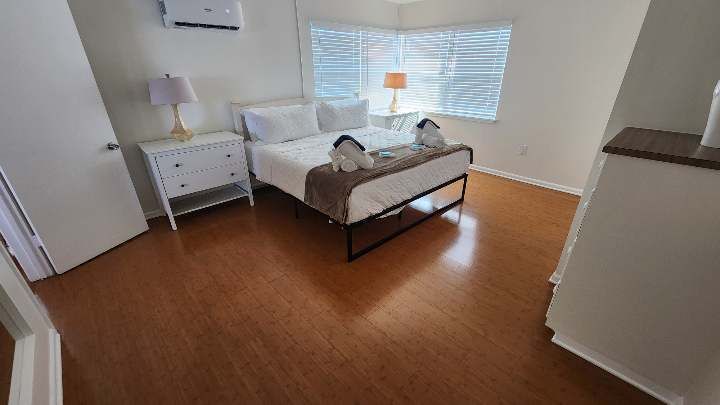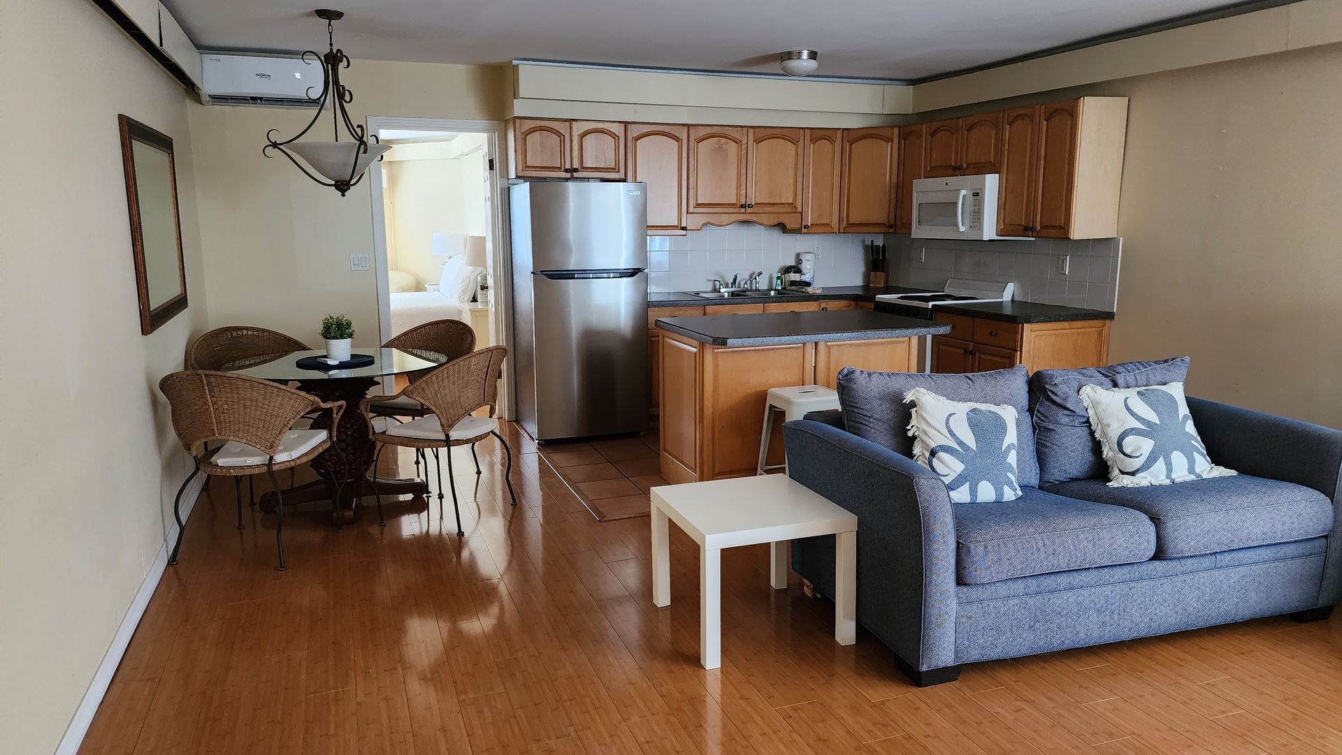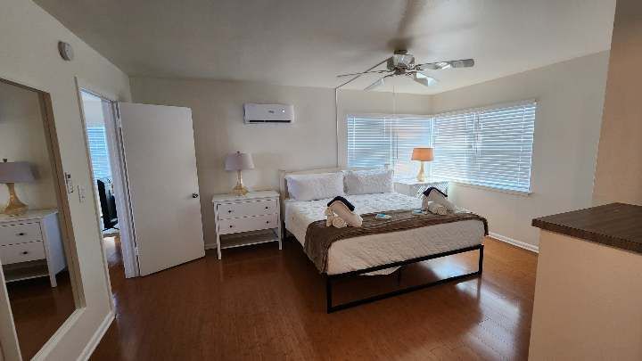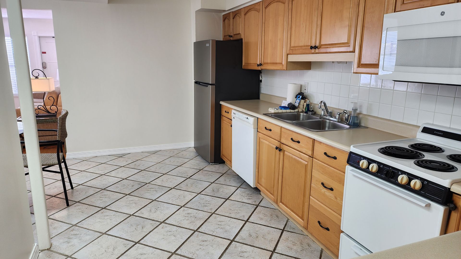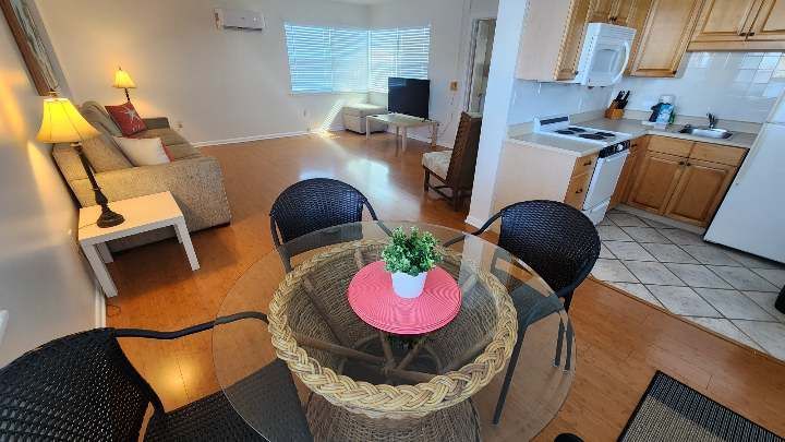 Fully remodeled 2 bedroom / 2 bathroom unit with full kitchen, dining room, and living room. The kitchen features a refrigerator/freezer, a cooktop stove, a toaster-oven/air-fryer combo, coffee maker, blender, and more! Both bathrooms have walk-in showers and single vanity sinks.