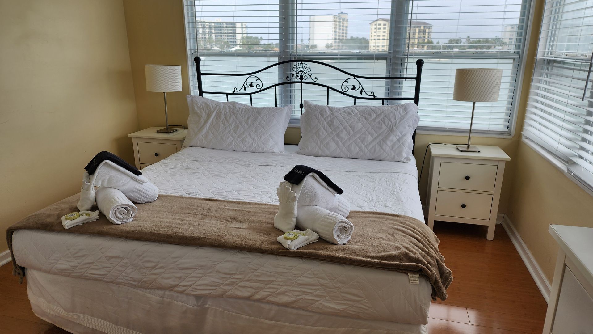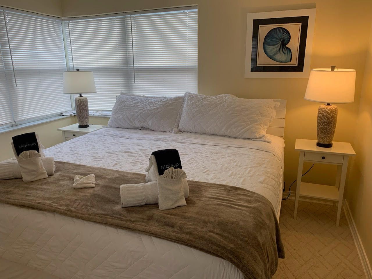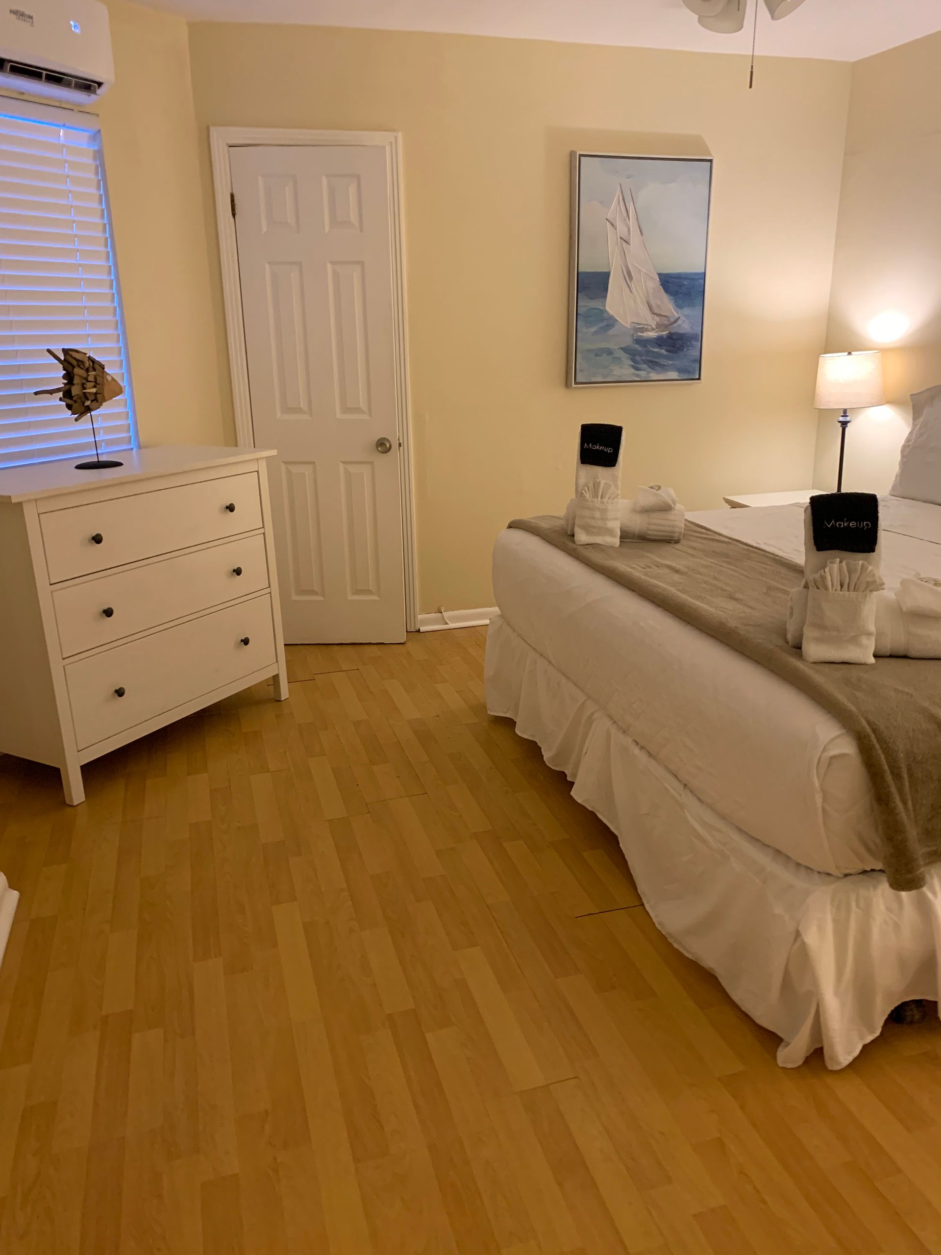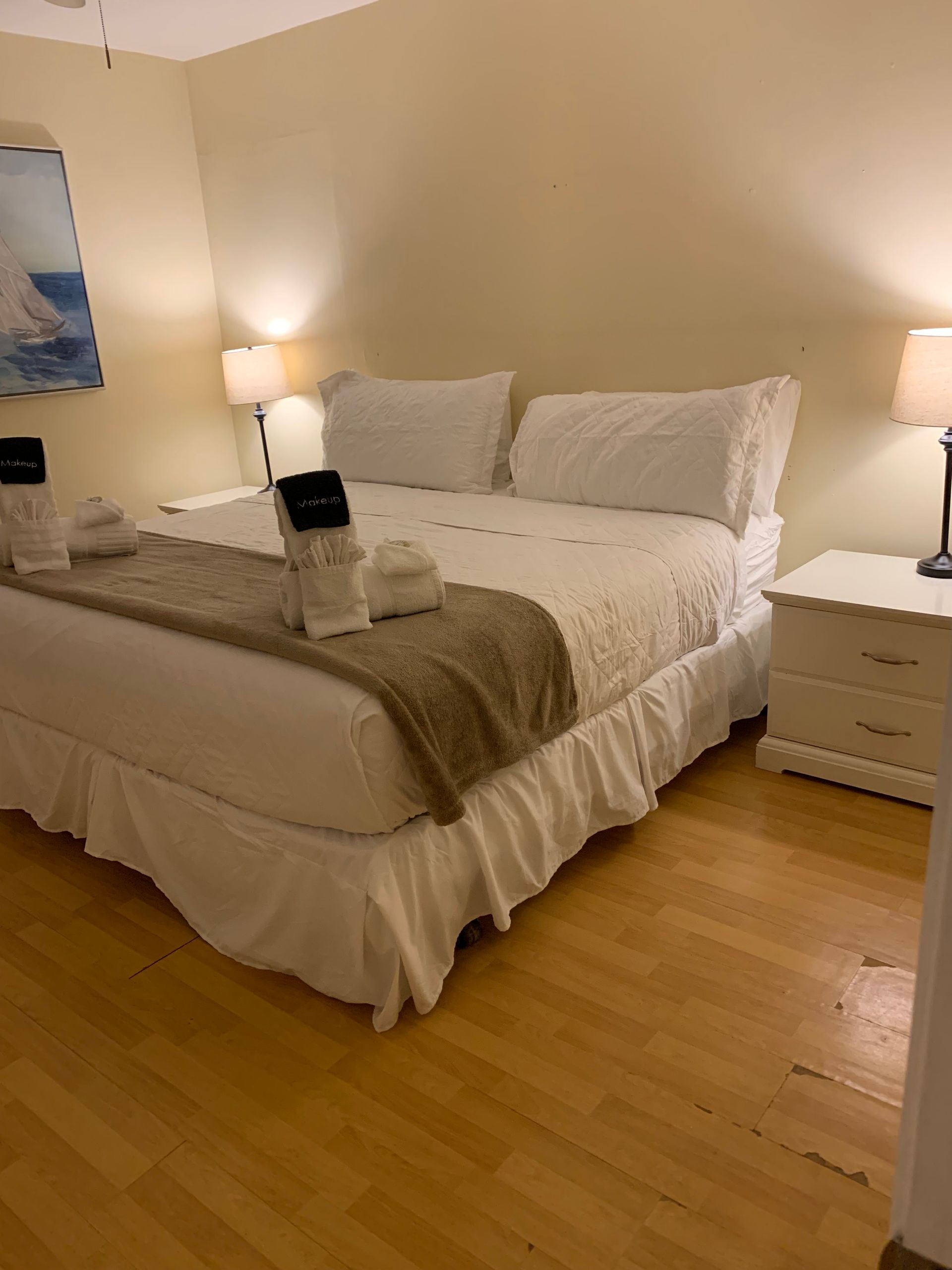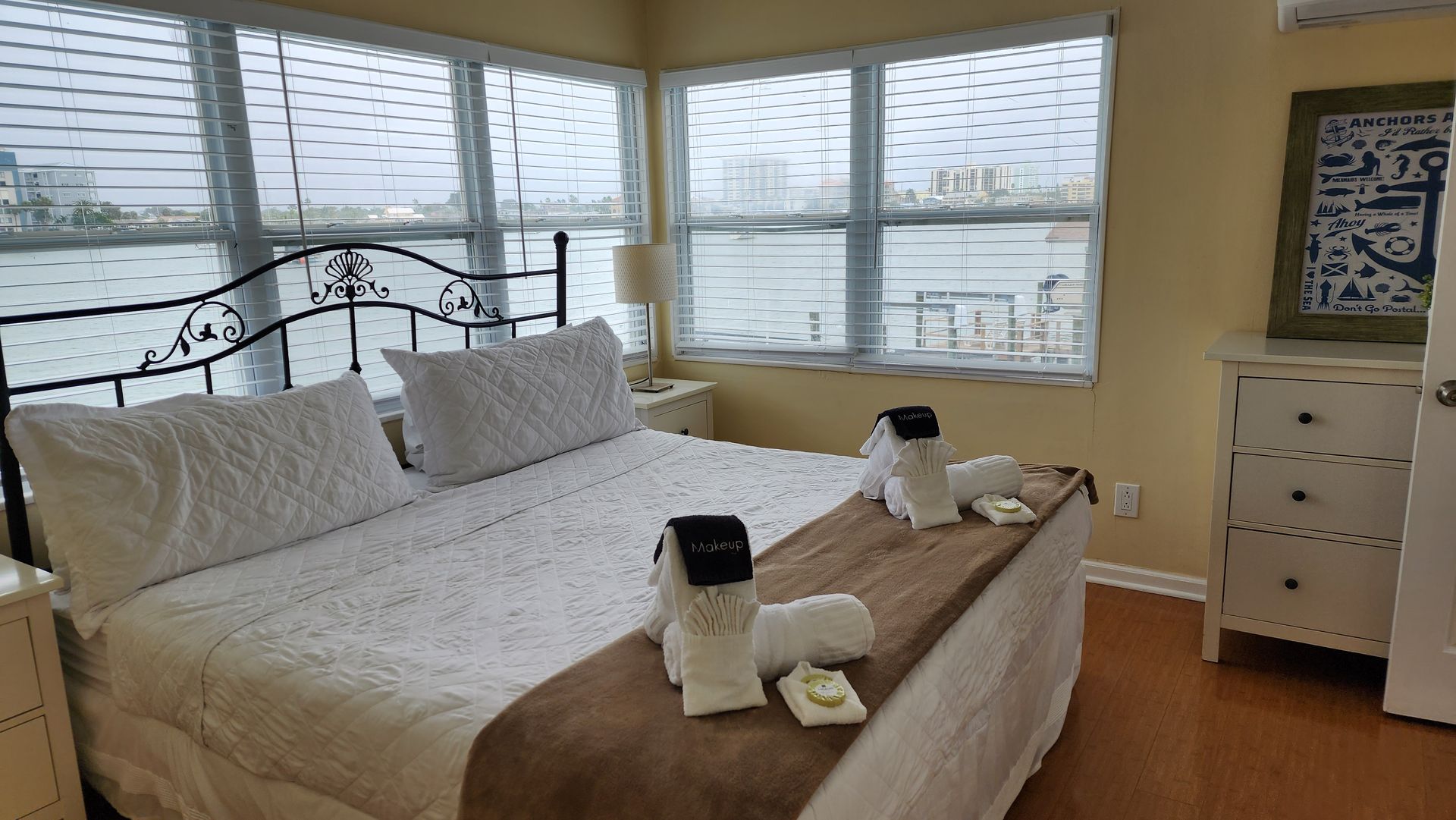 Waterfront 2 bedroom / 2 bathroom large condo unit on the 1st floor with full kitchen, dining room, and living room. This is one of our largest rooms available at approx. 1,000 sq ft. The kitchen features a refrigerator/freezer, 4-burner stove w/oven, dishwasher, microwave, coffee maker, blender, and much more! The first bedroom has a king-size bed and en-suite bathroom with a walk-in shower and vanity sink. The second bedroom has two full/double-sized beds and an en-suite bathroom with a tub/shower combination and vanity sink.