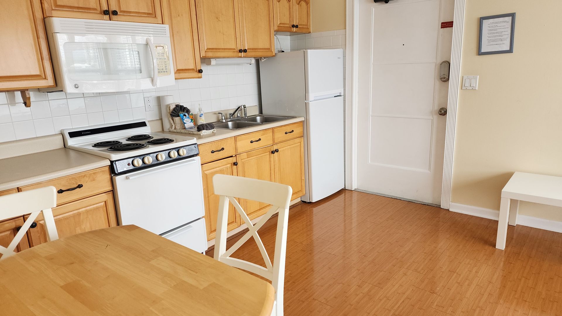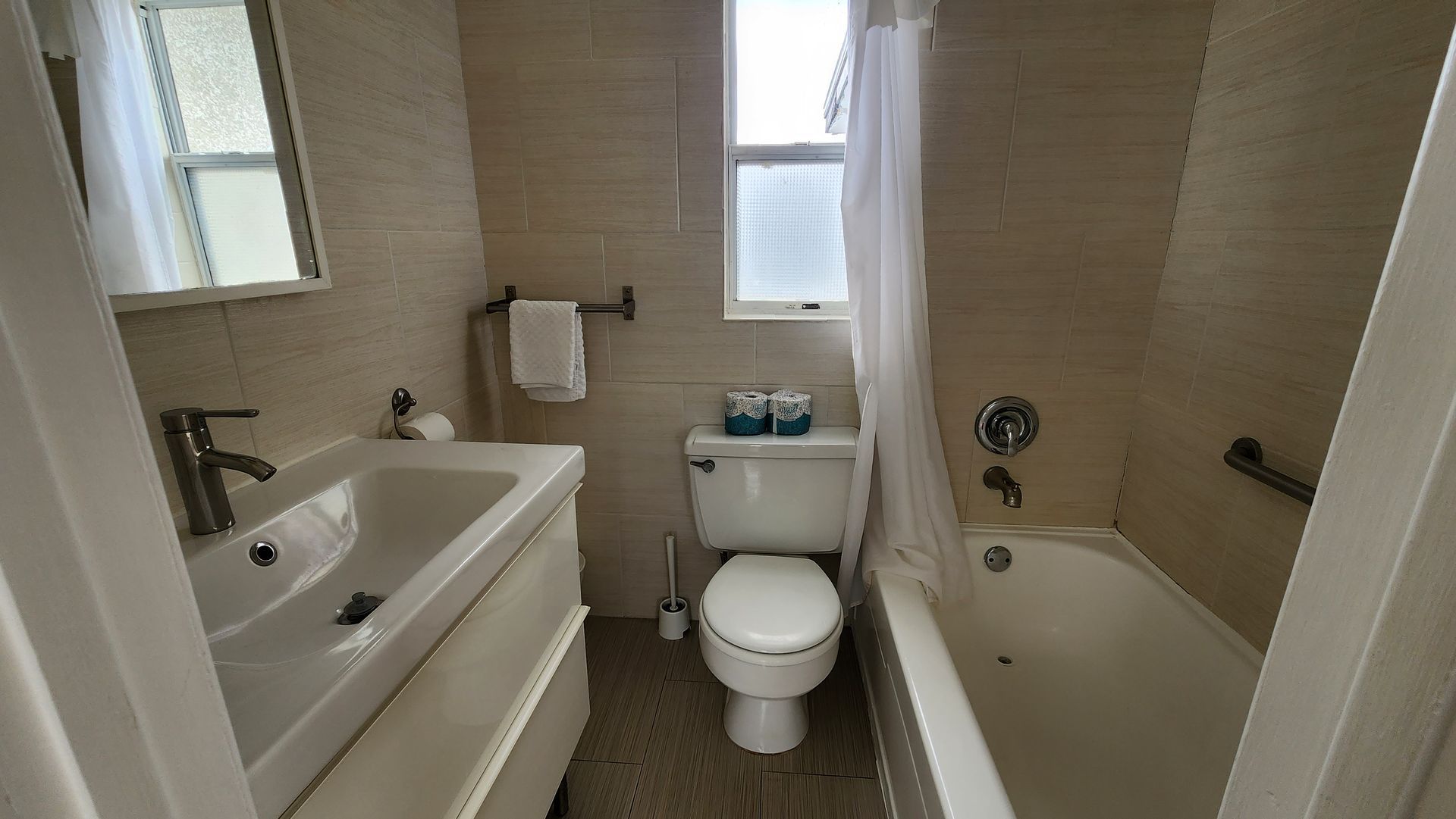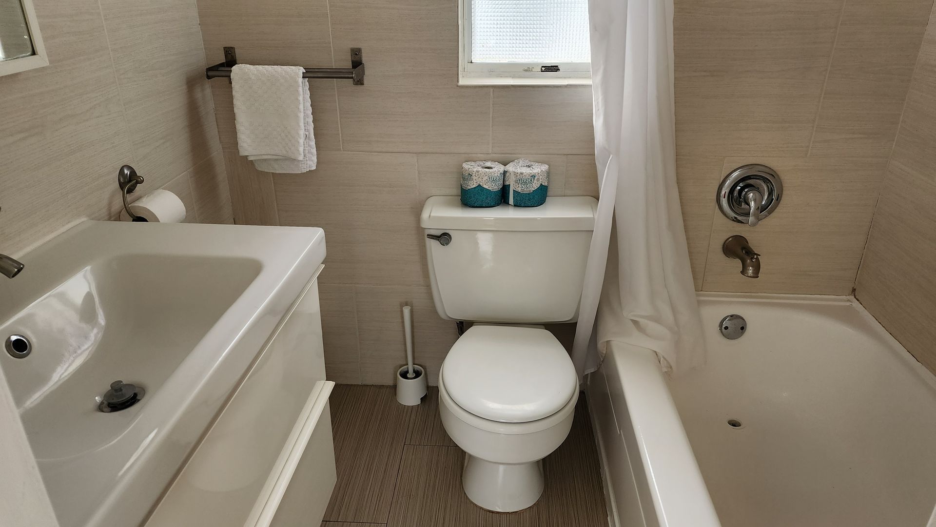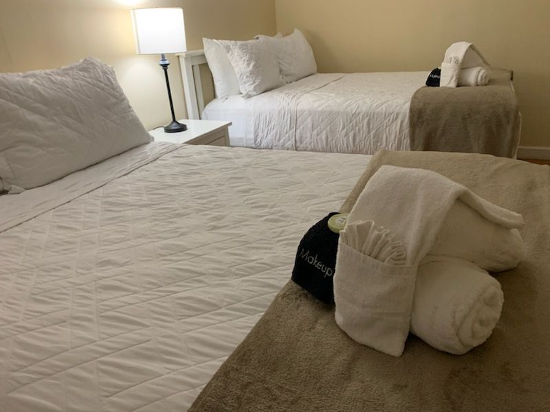 2nd floor 1 bedroom / 1 bathroom unit with full kitchen. The kitchen features a refrigerator/freezer, 4-burner stove w/oven, a microwave, coffee maker, blender, and more! The full bathrooms have either a shower or bathtub/shower combination and single vanity sinks.