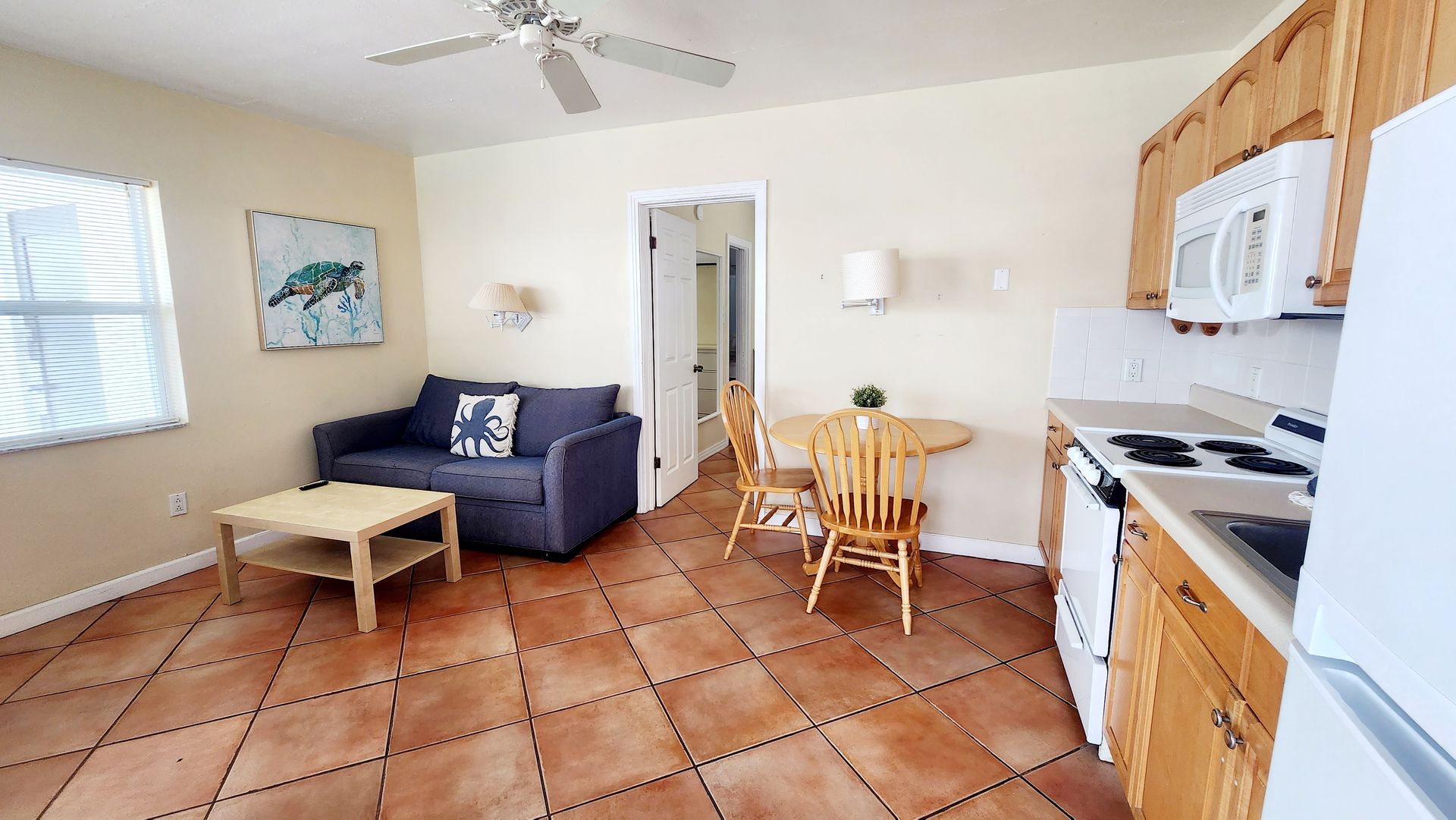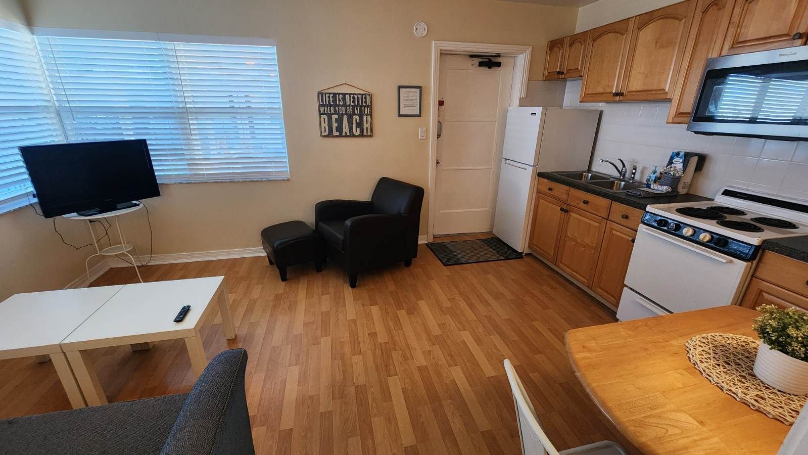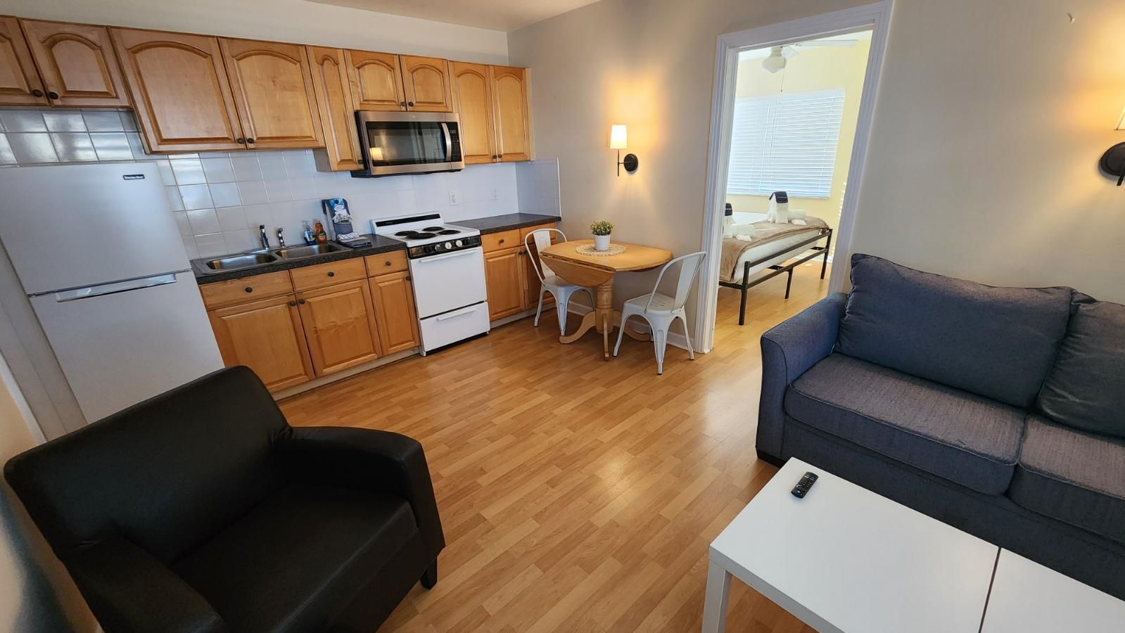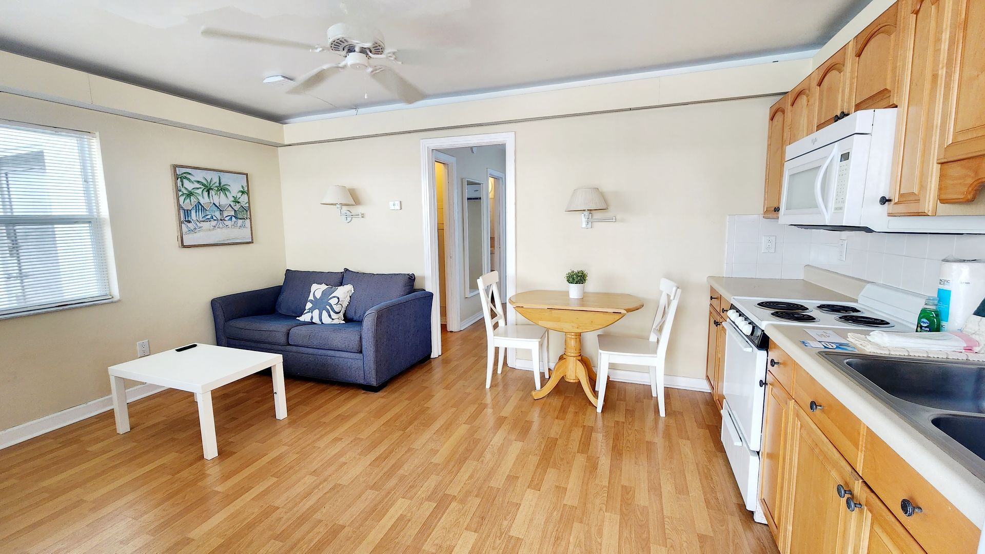 2nd floor studio-style unit with full kitchen. The kitchen features a refrigerator/freezer, 4-burner stove w/oven, a microwave, coffee maker, blender, and more! The full bathroom has a bathtub/shower combination and single vanity sink.