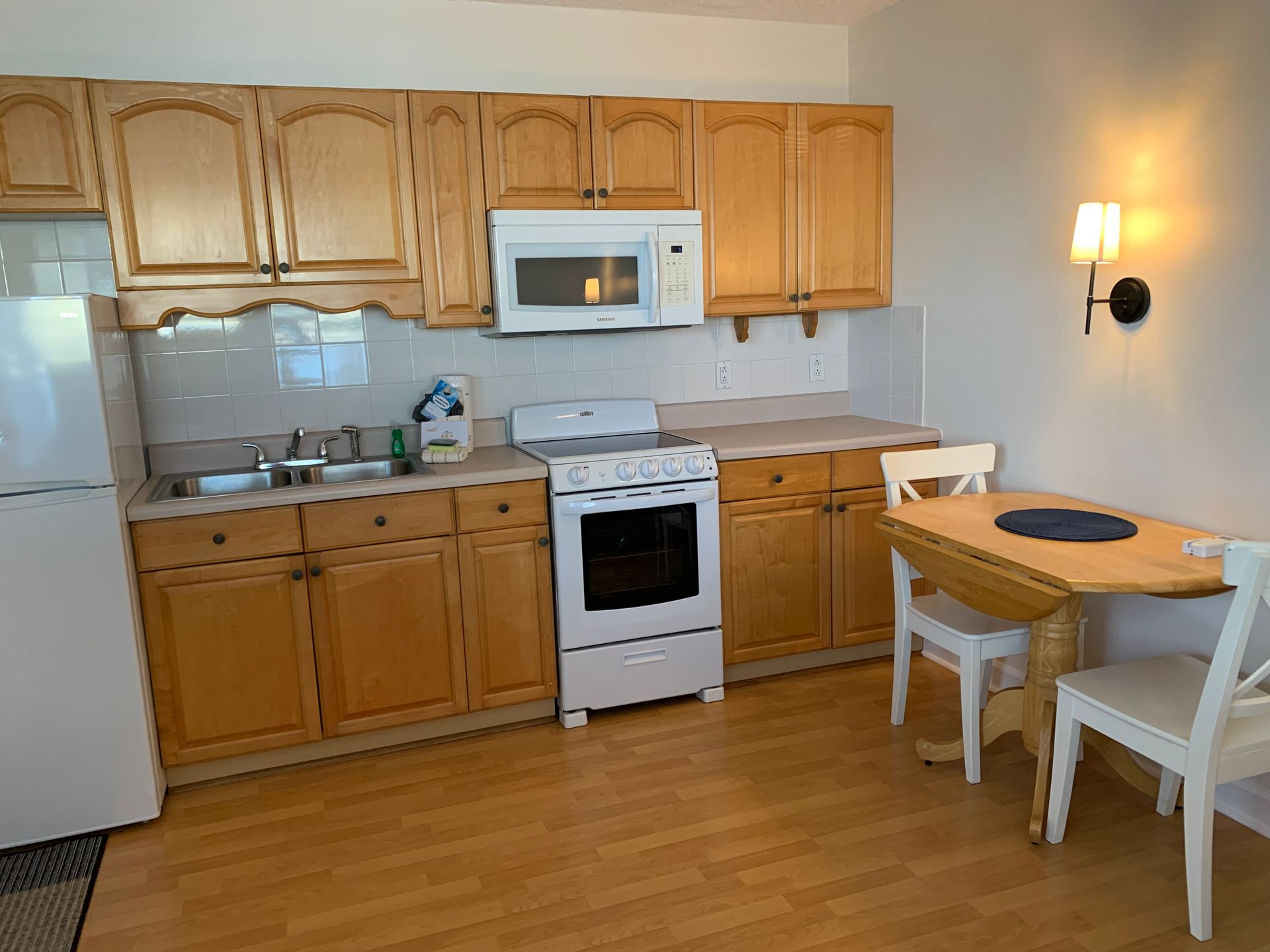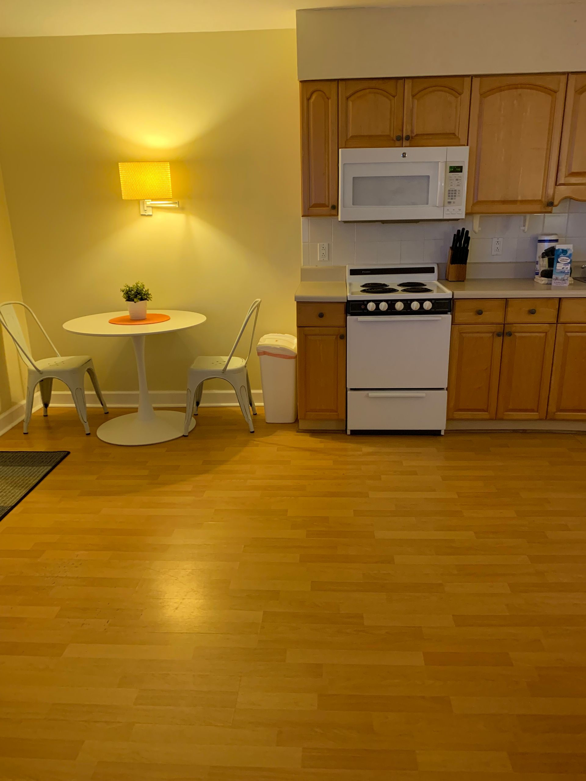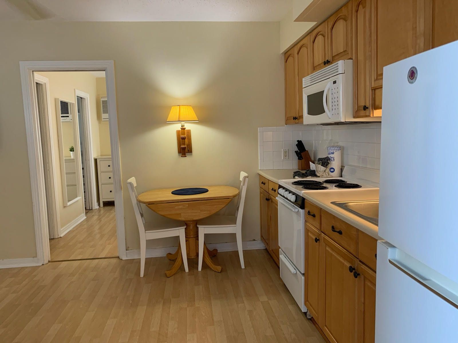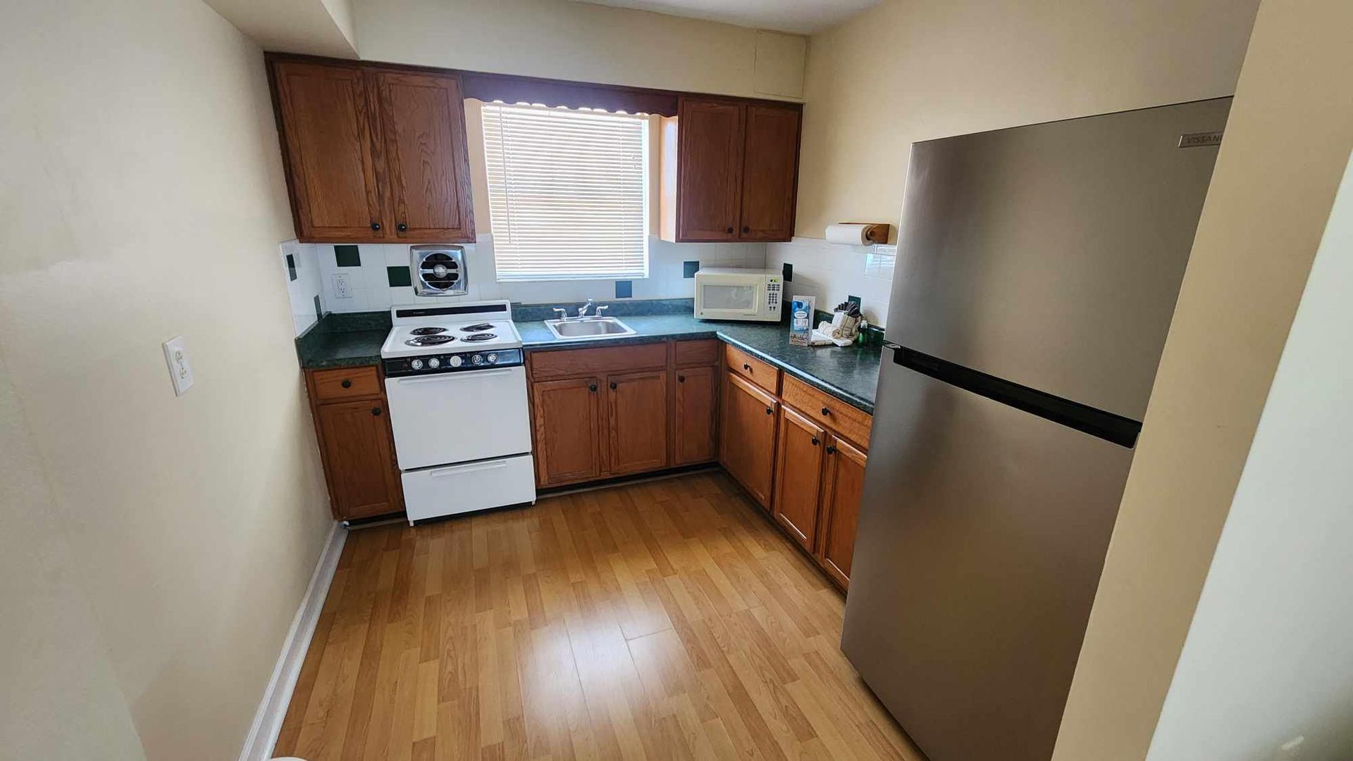 2nd floor studio-style unit with full kitchen. The kitchen features a refrigerator/freezer, 4-burner stove w/oven, a microwave, coffee maker, blender, and more! The full bathroom has a bathtub/shower combination and single vanity sink.