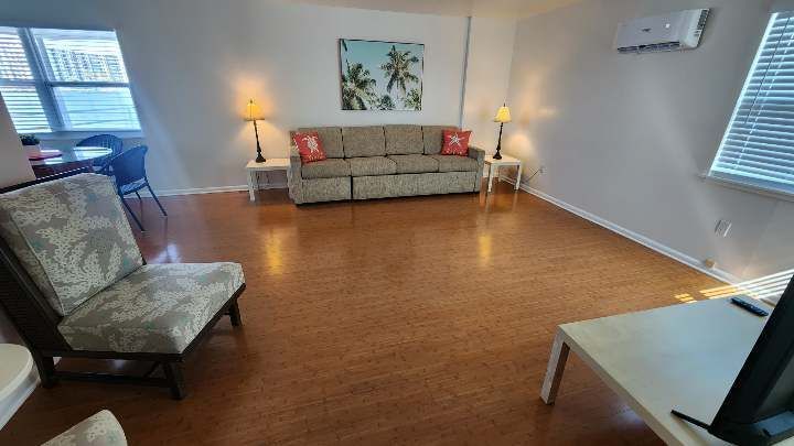 Waterfront 1 bedroom / 1 bathroom unit on the 1st floor with full kitchen, dining room, and living room. The kitchen features a refrigerator/freezer, 4-burner stove w/oven, a microwave, coffee maker, blender, and more! The full bathroom has a bathtub/shower combination.